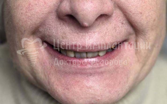 Мужчина 67 лет обратился в Центр имплантации доктора Федорова с проблемой пародонтоза, отсутствием большей части зубов, подвижностью и плохим внешним состоянием оставшихся зубов.