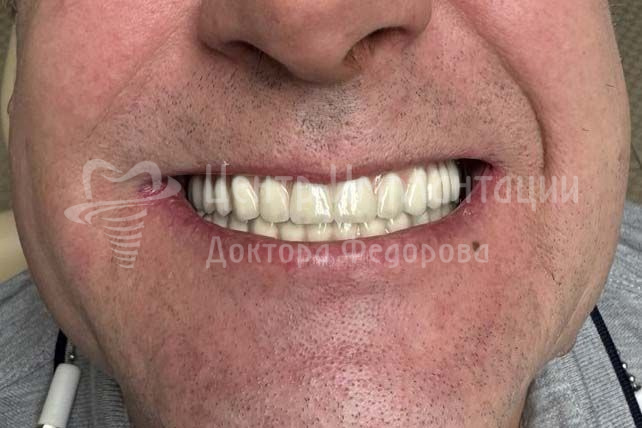 Врач провел имплантацию всех зубов. Следующие 6 месяцев пациент адаптировался с временным протезом. Посещал регулярно контрольные визиты, на которых врач проверял приживление имплантатов и удобство жевания. После полного приживления имплантатов адаптационную конструкцию заменили на металлокерамические протезы. Пациент рад новым зубам и доволен тем, что может полноценно жевать. «Быстро сделали имплантаты на верх и низ. Обратился за качественным лечением и все прошло без боли» – говорит мужчина.