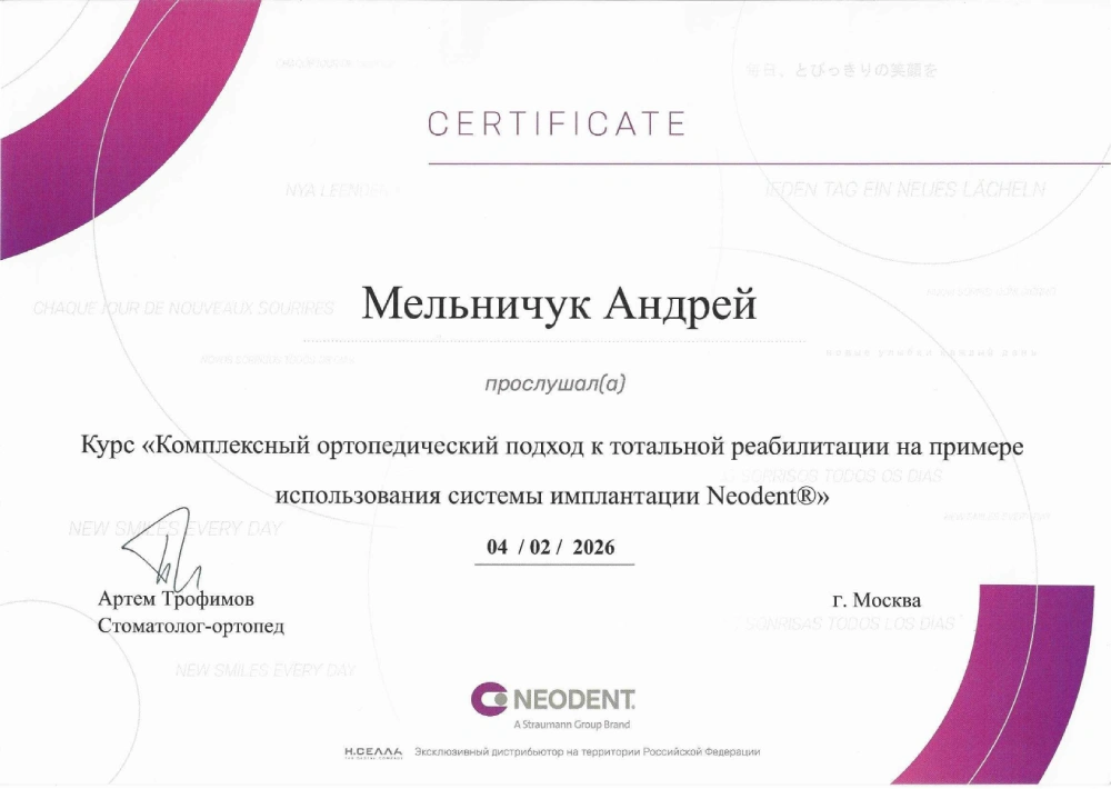 Мельничук Андрей Анатольевич — стоматолог-ортопед высшей категории, более 20 лет возвращающий пациентам уверенность в улыбке. Его основная специализация — тотальная реабилитация челюсти по протоколам All-on-4 / All-on-6, в портфолио врача свыше 4 000 успешно завершенных ортопедических работ.
