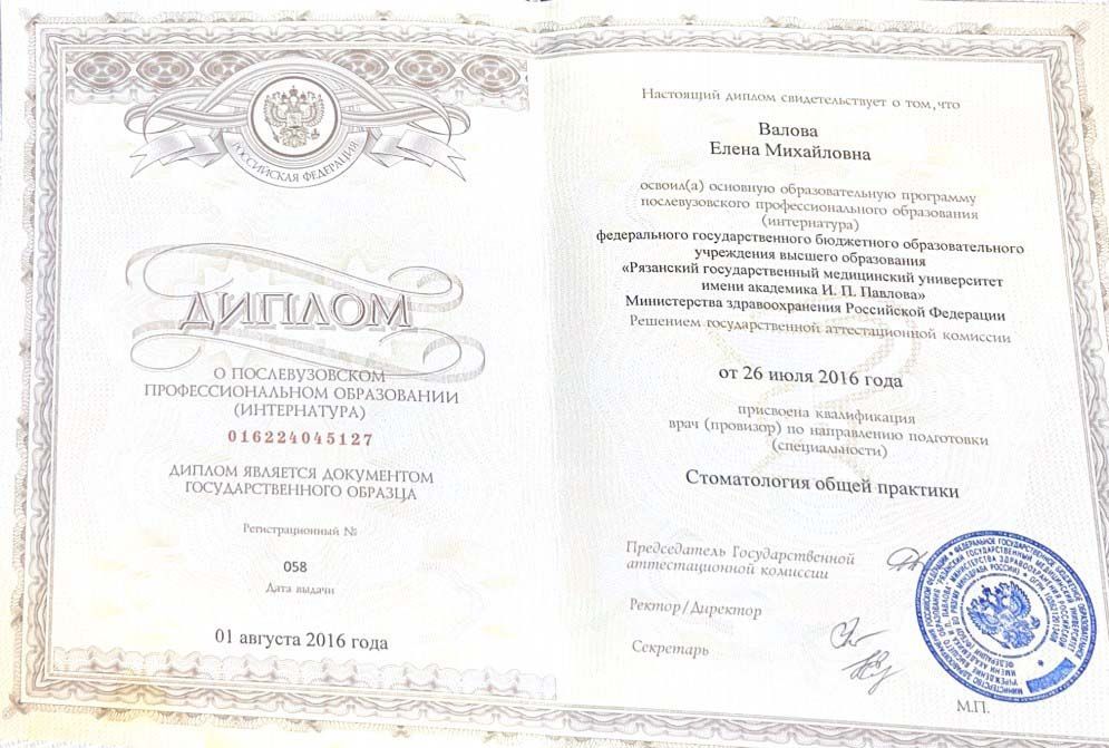 2016 г. — Интернатура в Рязанском государственном медицинском университете имени академика И.П. Павлова. Присвоена квалификация по специальности «Стоматология общей практики».