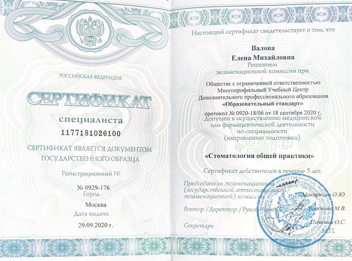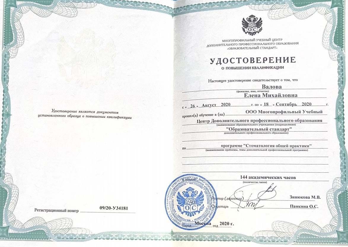 2020 г. — Повышение квалификации в ООО МУЦ ДПО «Образовательный стандарт». Удостоверение и сертификат специалиста по специальности «Стоматология общей практики».