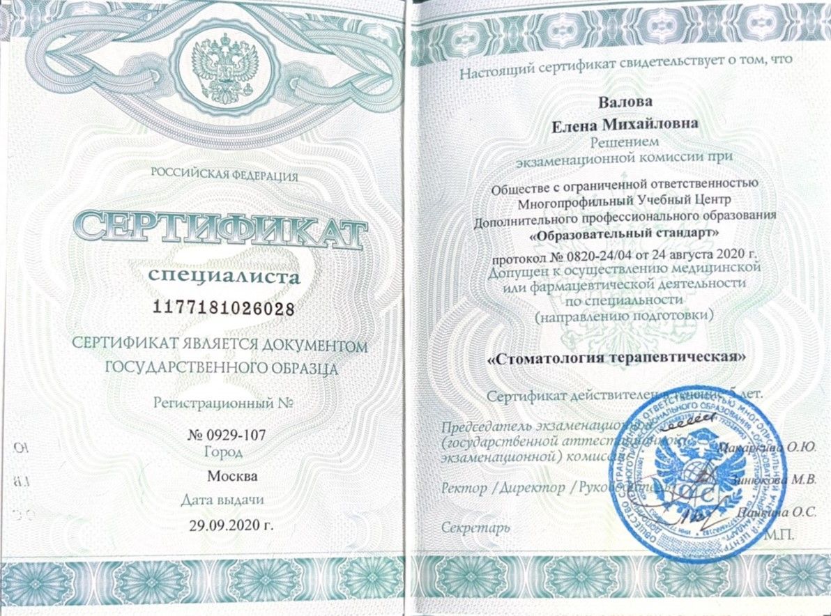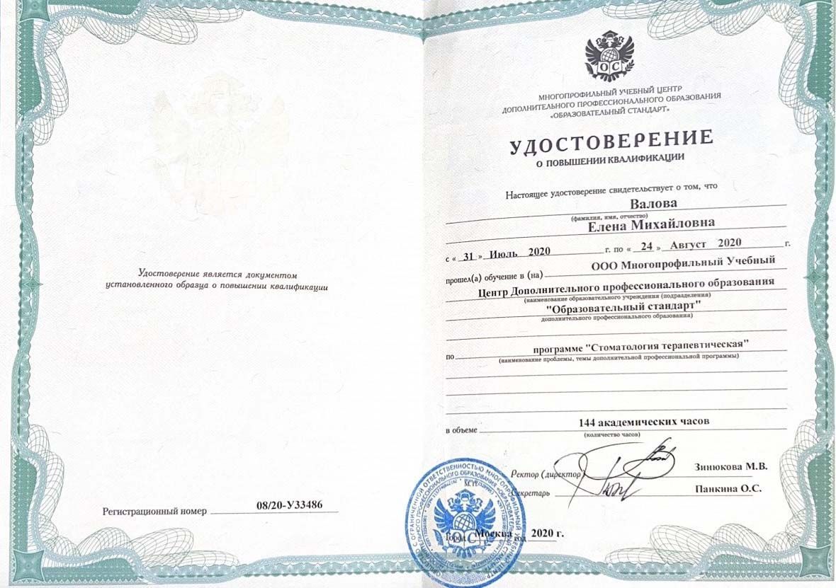 2020 г. — Повышение квалификации в ООО МУЦ ДПО «Образовательный стандарт». Удостоверение и сертификат специалиста по специальности «Стоматология терапевтическая».