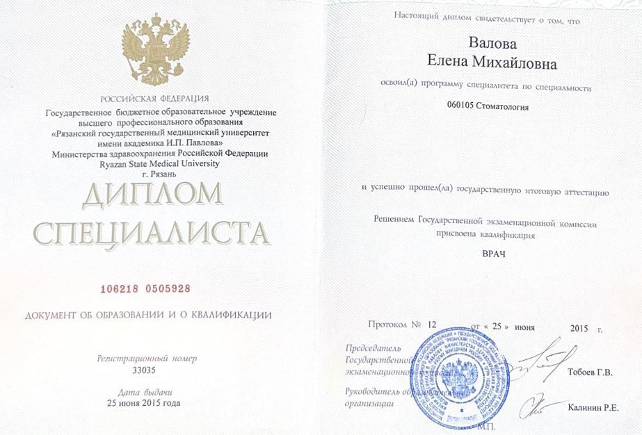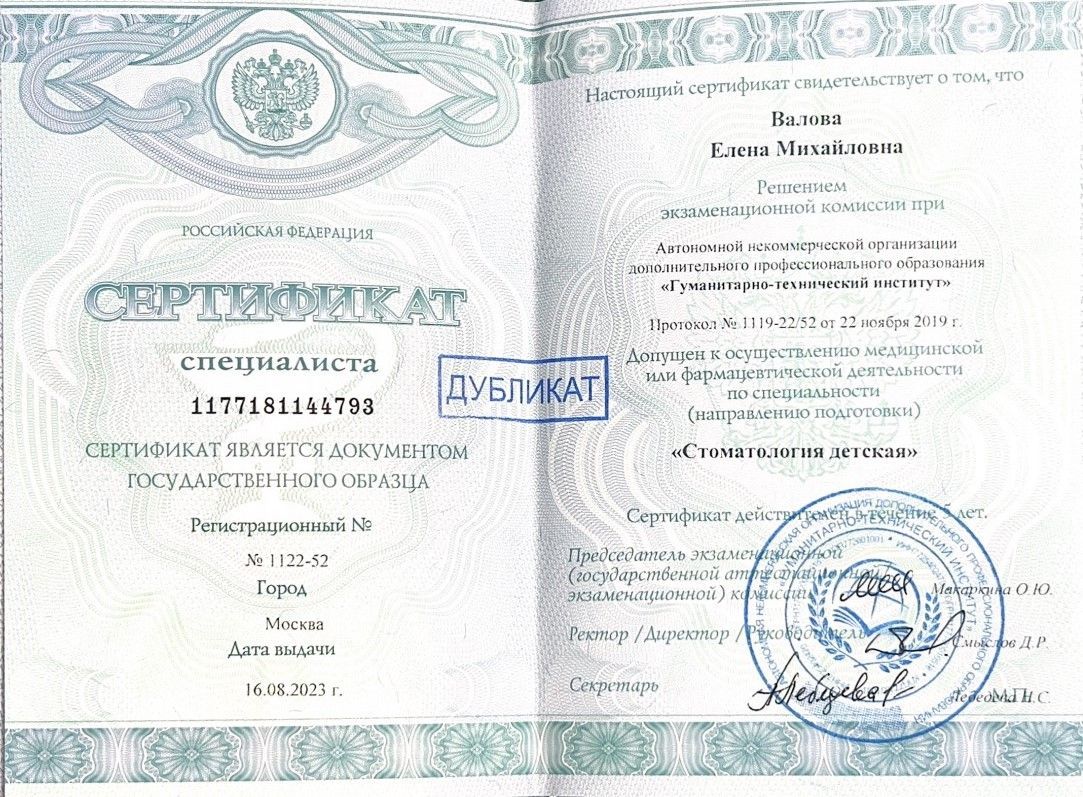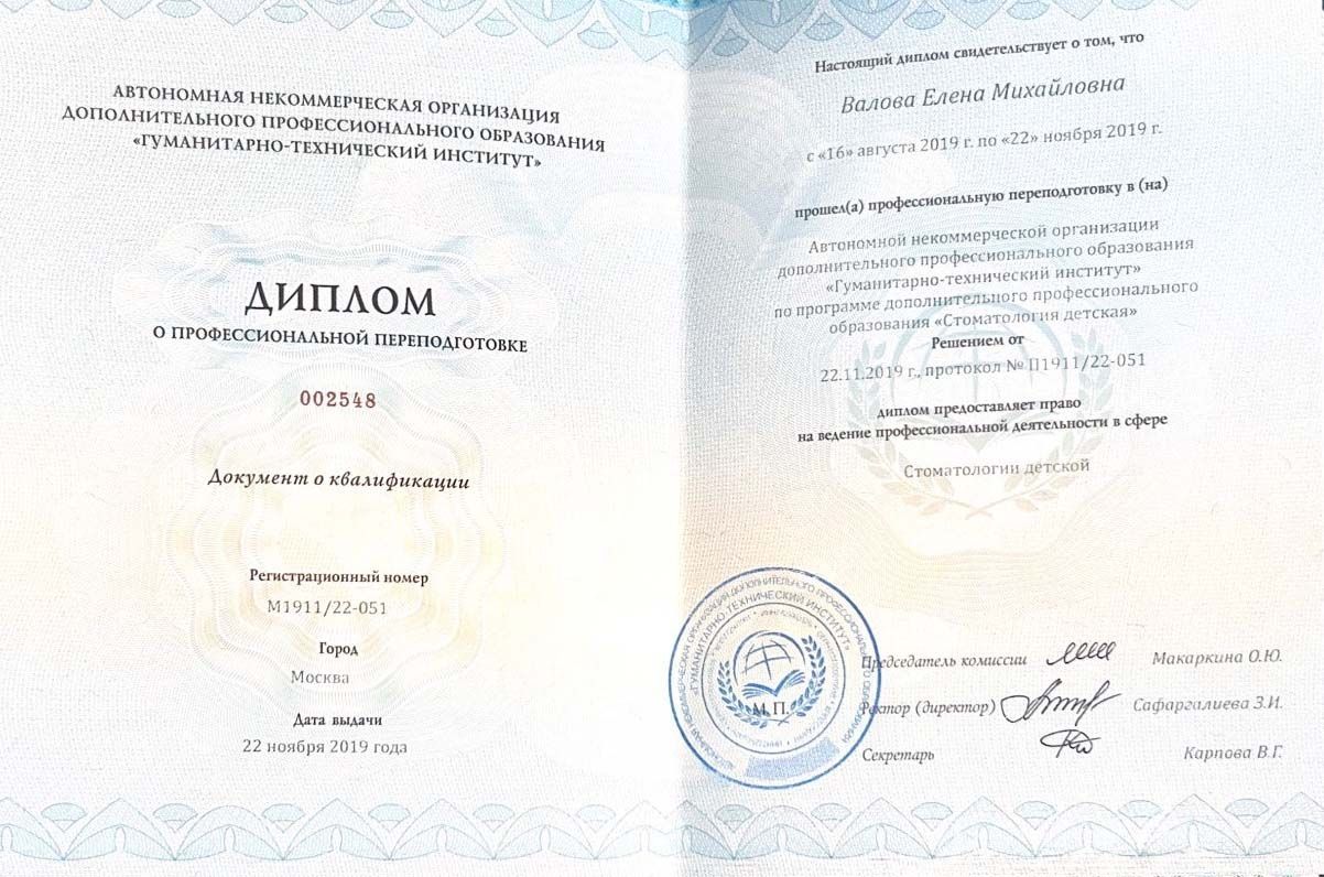 2019 г. — Профессиональная переподготовка в АНО ДПО «Гуманитарно-технический институт». Диплом и сертификат специалиста по программе «Стоматология детская».
